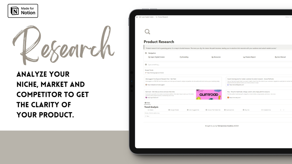 Created on Notion, a powerful collaboration and productivity tool, our comprehensive template is designed to streamline every step of your digital product journey. From developing your brand niche to managing marketing materials and monitoring sales, Super Digital Creator has you covered.