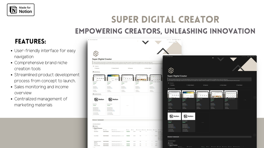 Super Digital Creator combines the best of digital product management with the flexibility and robustness of Notion. It's time to unlock your digital creativity and take your projects to new heights with Super Digital Creator on Notion!