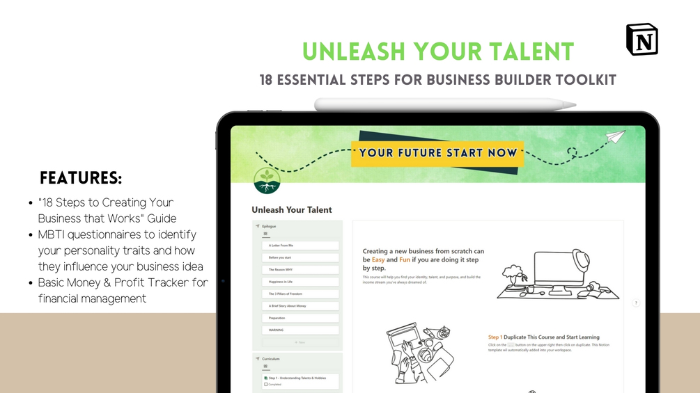 Get started today and take the first step towards building the business of your dreams and achieving a happy, fulfilling life with "Unleash Your Talent | The 18 Essential Steps for Business Builder Toolkit".